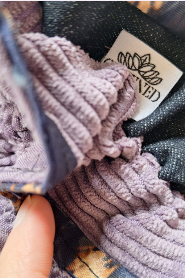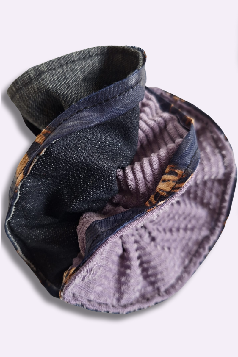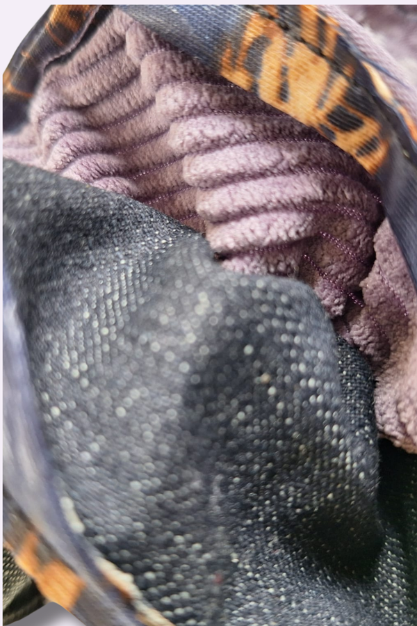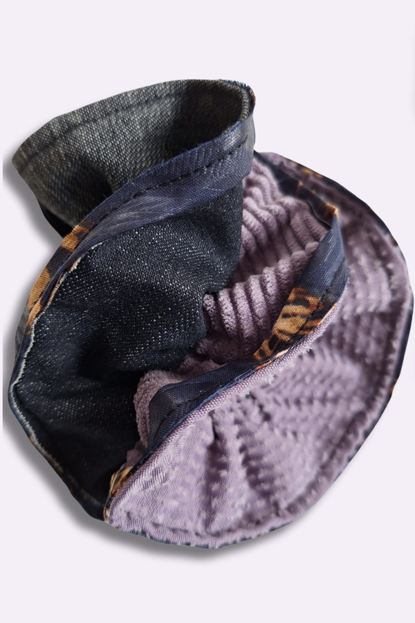 Ribstof, jeans én Afrikaanse stof in één scrunchie?! Wat wil je nog meer! Deze XL scrunchie sla je één keer om je knot of staart en je bent helemaal klaar voor de dag.