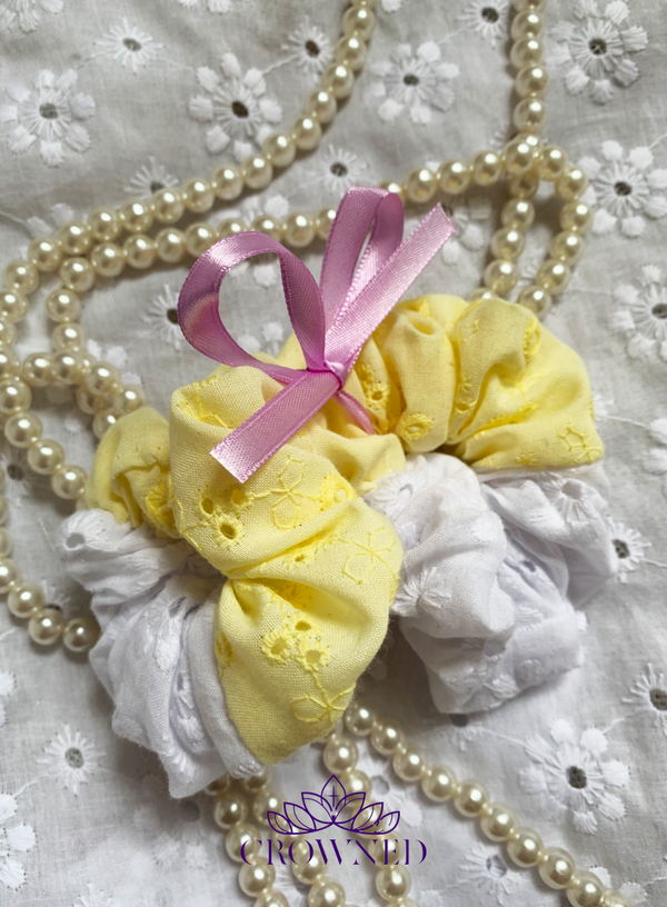 Mini scrunchies gele en witte broderie bloemetjes stof